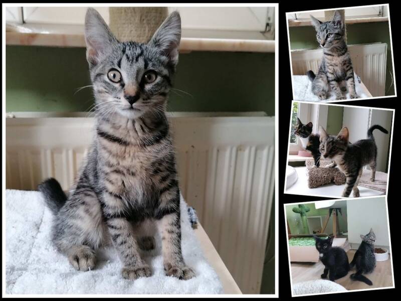 werd als enig kitten geboren uit een zwerfkat en groeide samen op met het iets jongere nest van een andere zwerfkat. Ze kwamen alle vijf in opvang toen ze een week of 7 waren.