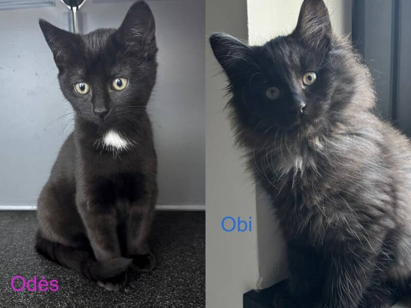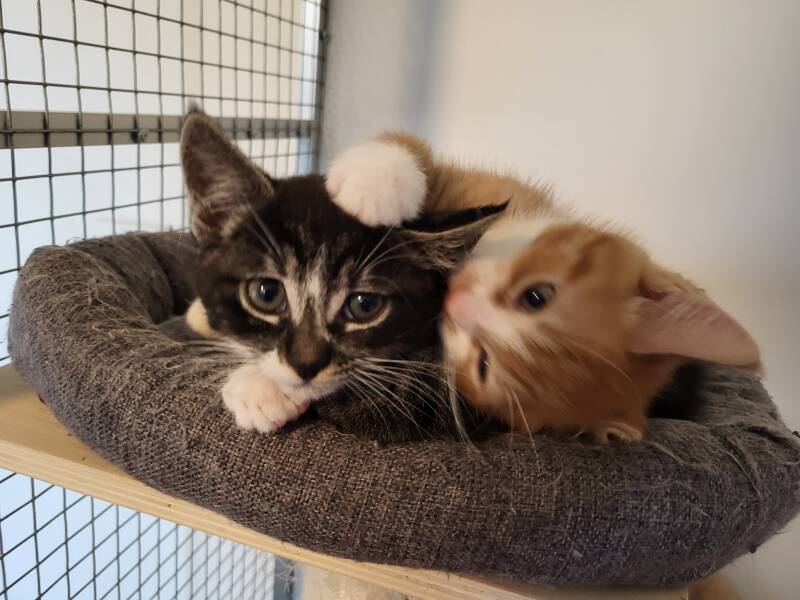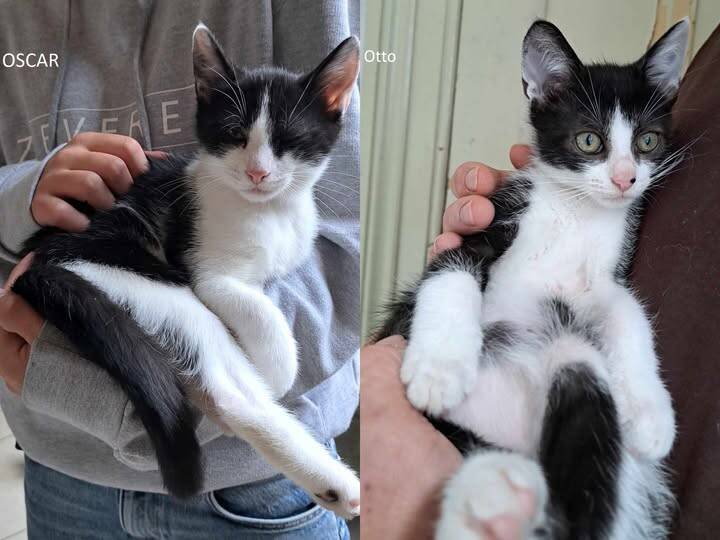 kwamen bij ons in opvang samen met nog 11 andere katten en kittens uit hetzelfde gezin. Ze waren toen een kleine twee maand oud en wogen amper 400 gram, hun andere broers en zussen waren helaas reeds gratis uitgedeeld.