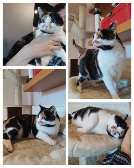 kwam 3 maanden geleden bij ons in opvang nadat ze al weken in iemands tuin bleef rondhangen. Het vreemde was dat ze een (te klein) wandeltuig aanhad dat deels los was gesprongen en een halsbandje. Ondanks verschillende oproepen en opsporingswerk, kon ze niet herenigd worden met haar eigenaar.